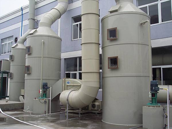洗涤塔一般采用气液逆流操作,洗涤塔系统之风机组将收集到的废气吸入洗涤塔内,流经填充层段(气/液接触反应之介质),让废气与填充物表面流动的药液(洗涤液)充分接触,以吸附废气中所含的酸性或碱性污物。洗涤后,废液收集至集水槽中,再排放至废水系统处理。洗涤塔筒体材料以玻璃钢(FRP)、聚氯乙烯(PP)材料为主,亦可采用聚丙稀(PVDF)、聚乙烯(PE)、不锈钢材料制作。立式洗涤塔标准配备:视窗及维修人孔、入风口法兰、出口法兰、洗涤液入口、溢流口排水口、填充层、除雾层、循环水泵浦、循环水过滤网、循环水管路、喷淋装置、附件及控制仪表组成。